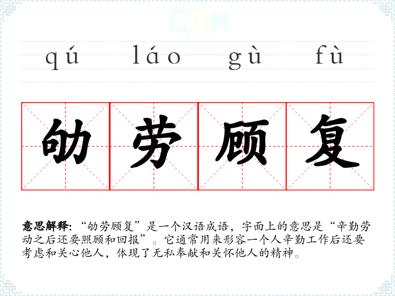 “劬劳顾复”是一个汉语成语,字面上的意思是“辛勤劳动之后还要照顾和回报”。它通常用来形容一个人辛勤工作后还要考虑和关心他人,体现了无私奉献和关怀他人的精神。