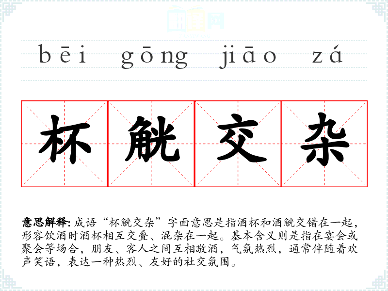 杯觥交杂 觥:酒器;交:交织。形容酒宴中相互频频举杯畅饮的热烈气氛。