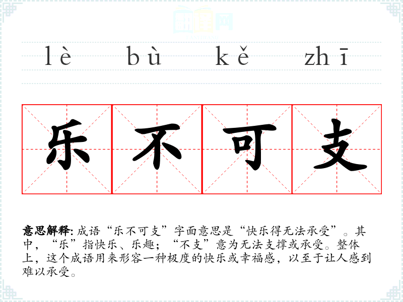 成语“乐不可支”字面意思是“快乐得无法承受”。其中,“乐”指快乐、乐趣;“不支”意为无法支撑或承受。整体上,这个成语用来形容一种极度的快乐或幸福感,以至于让人感到难以承受。