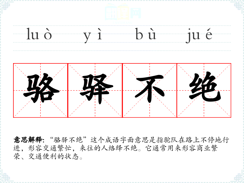 “骆驿不绝”这个成语字面意思是指驼队在路上不停地行进,形容交通繁忙,来往的人络绎不绝。它通常用来形容商业繁荣、交通便利的状态。