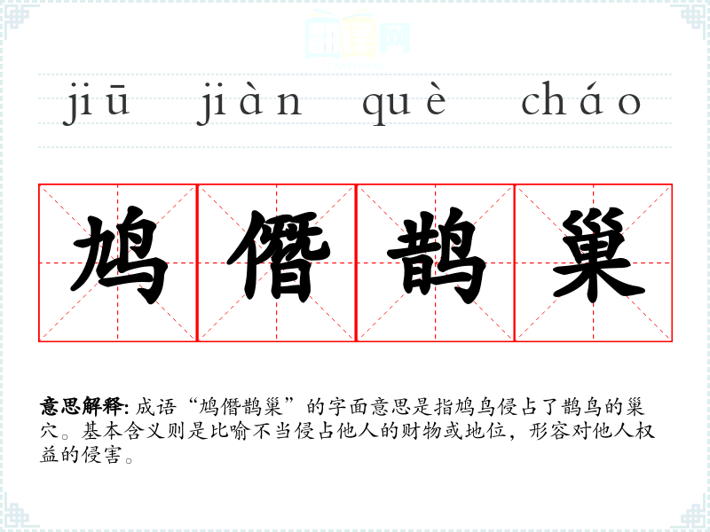 成语“鸠僭鹊巢”的字面意思是指鸠鸟侵占了鹊鸟的巢穴。基本含义则是比喻不当侵占他人的财物或地位,形容对他人权益的侵害。
