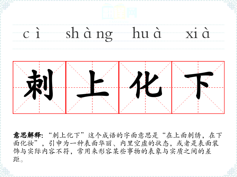 “刺上化下”这个成语的字面意思是“在上面刺绣,在下面化妆”,引申为一种表面华丽、内里空虚的状态,或者是表面装饰与实际内容不符,常用来形容某些事物的表象与实质之间的差距。