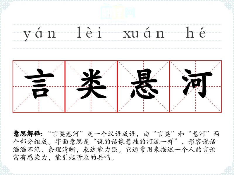 “言类悬河”是一个汉语成语,由“言类”和“悬河”两个部分组成。字面意思是“说的话像悬挂的河流一样”,形容说话滔滔不绝、条理清晰,表达能力强。它通常用来描述一个人的言论富有感染力,能引起听众的共鸣。