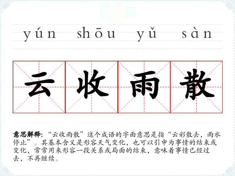 “云收雨散”这个成语的字面意思是指“云彩散去,雨水停止”。其基本含义是形容天气变化,也可以引申为事情的结束或变化,常常用来形容一段关系或局面的结束,意味着事情已经过去,不再继续。