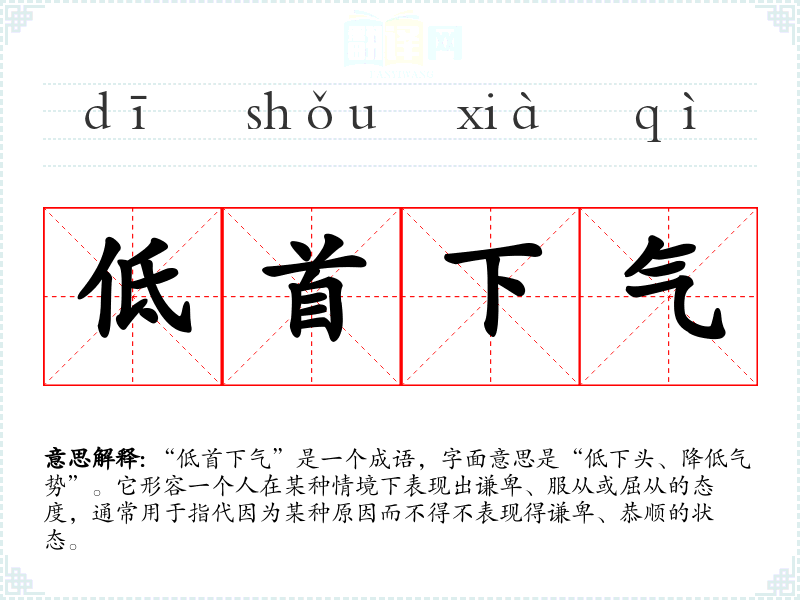 “低首下气”是一个成语,字面意思是“低下头、降低气势”。它形容一个人在某种情境下表现出谦卑、服从或屈从的态度,通常用于指代因为某种原因而不得不表现得谦卑、恭顺的状态。