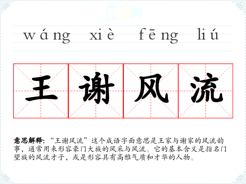 “王谢风流”这个成语字面意思是王家与谢家的风流韵事,通常用来形容豪门大族的风采与风流。它的基本含义是指名门望族的风流才子,或是形容具有高雅气质和才华的人物。