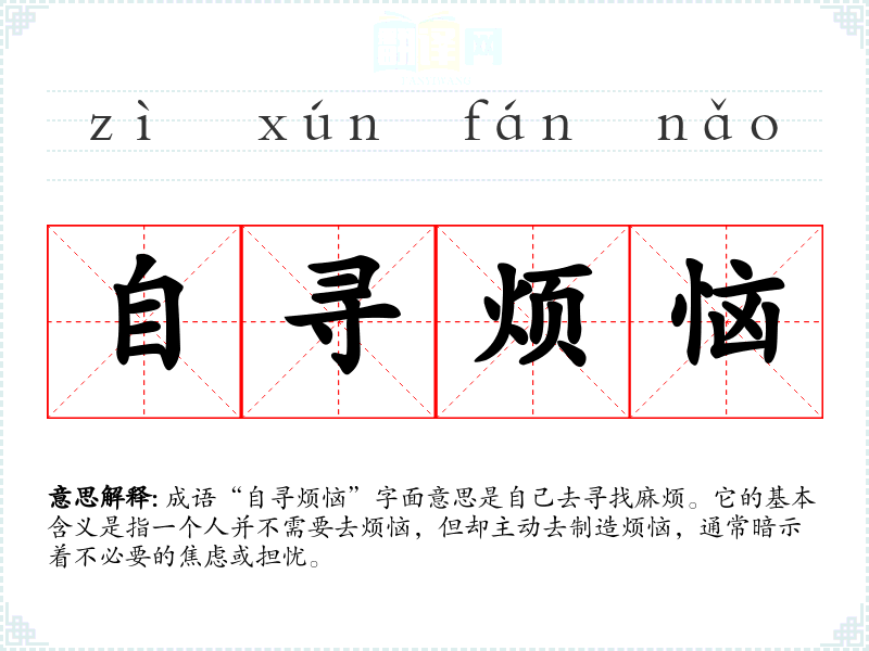 成语“自寻烦恼”字面意思是自己去寻找麻烦。它的基本含义是指一个人并不需要去烦恼,但却主动去制造烦恼,通常暗示着不必要的焦虑或担忧。