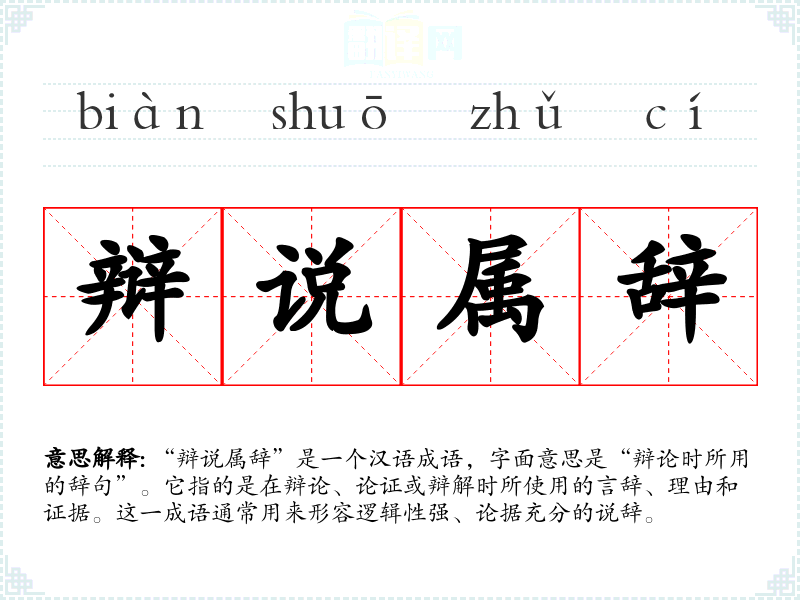 “辩说属辞”是一个汉语成语,字面意思是“辩论时所用的辞句”。它指的是在辩论、论证或辩解时所使用的言辞、理由和证据。这一成语通常用来形容逻辑性强、论据充分的说辞。