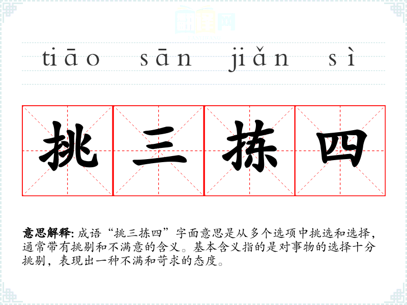 成语“挑三拣四”字面意思是从多个选项中挑选和选择,通常带有挑剔和不满意的含义。基本含义指的是对事物的选择十分挑剔,表现出一种不满和苛求的态度。