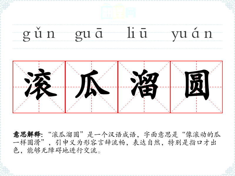 “滚瓜溜圆”是一个汉语成语,字面意思是“像滚动的瓜一样圆滑”,引申义为形容言辞流畅,表达自然,特别是指口才出色,能够无障碍地进行交流。