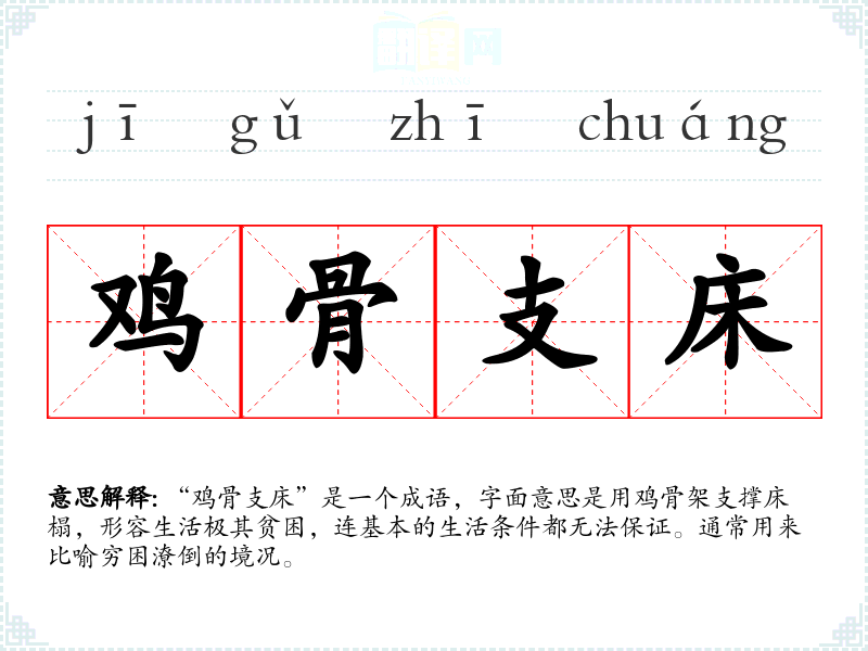 “鸡骨支床”是一个成语,字面意思是用鸡骨架支撑床榻,形容生活极其贫困,连基本的生活条件都无法保证。通常用来比喻穷困潦倒的境况。