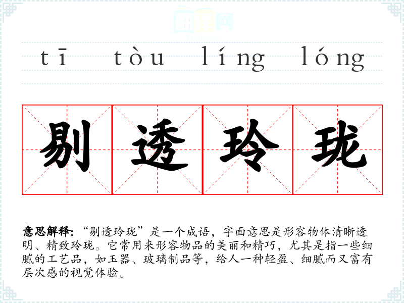 “剔透玲珑”给人一种轻盈、愉悦的感觉,常常联想到细腻的工艺和美好的生活。它也激发了人们对美的向往,提醒我们关注生活中的细节,享受生活的美好。
