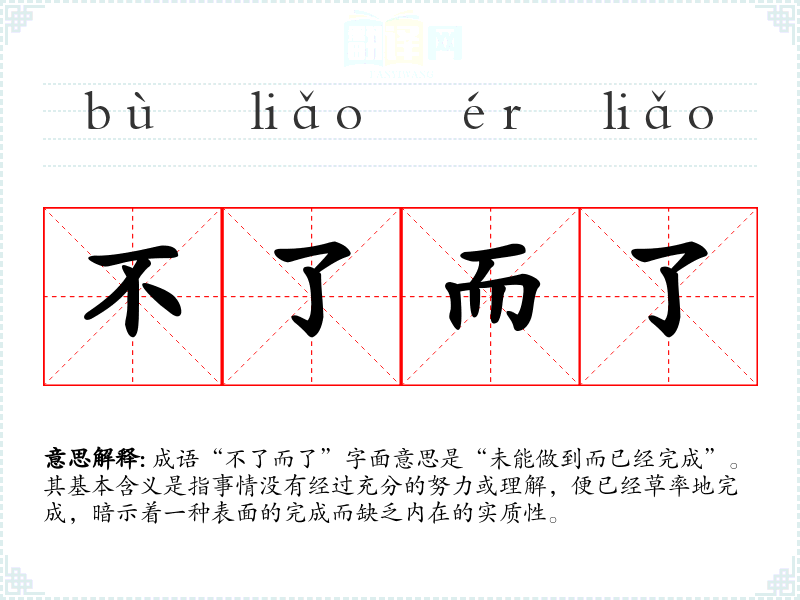 成语“不了而了”字面意思是“未能做到而已经完成”。其基本含义是指事情没有经过充分的努力或理解,便已经草率地完成,暗示着一种表面的完成而缺乏内在的实质性。