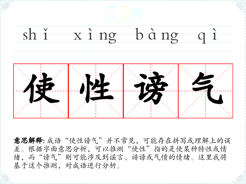 成语“使性谤气”并不常见,可能存在拼写或理解上的误差。根据字面意思分析,可以推测“使性”指的是使某种特性或情绪,而“谤气”则可能涉及到谣言、诽谤或气愤的情绪。这里我将基于这个推测,对成语进行分析。