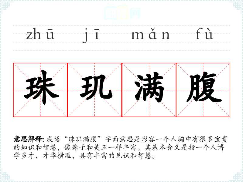 在英语中,类似的表达可以是“a wealth of knowledge”或“full of wisdom”,它们都传达了知识丰富的意思,但可能没有像“珠玑满腹”那样强烈的文化象征意义。