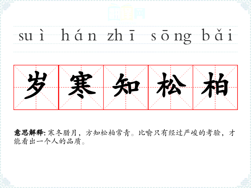 | 岁寒知松柏 | 寒冬腊月,方知松柏常青。比喻只有经过严峻的考验,才能看出一个人的品质。 |