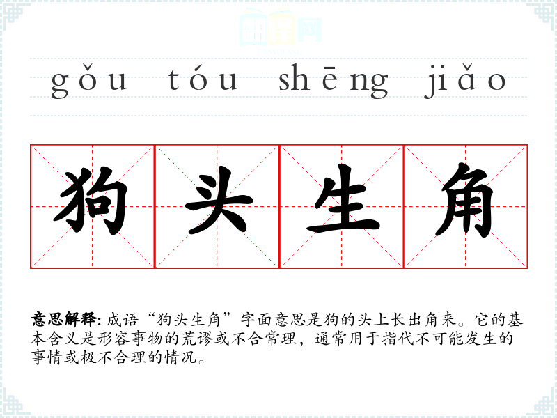 成语“狗头生角”字面意思是狗的头上长出角来。它的基本含义是形容事物的荒谬或不合常理,通常用于指代不可能发生的事情或极不合理的情况。