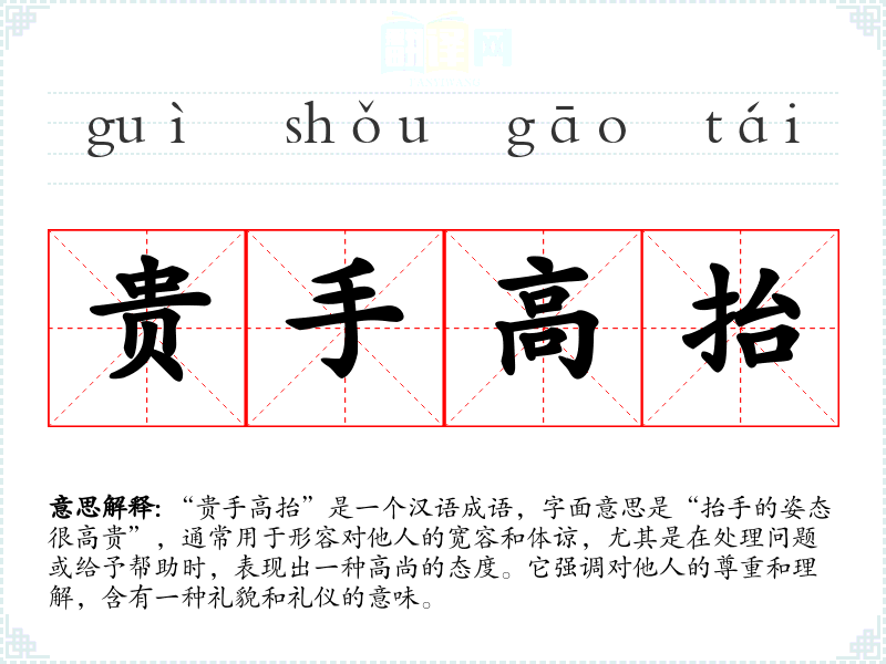 “贵手高抬”是一个汉语成语,字面意思是“抬手的姿态很高贵”,通常用于形容对他人的宽容和体谅,尤其是在处理问题或给予帮助时,表现出一种高尚的态度。它强调对他人的尊重和理解,含有一种礼貌和礼仪的意味。