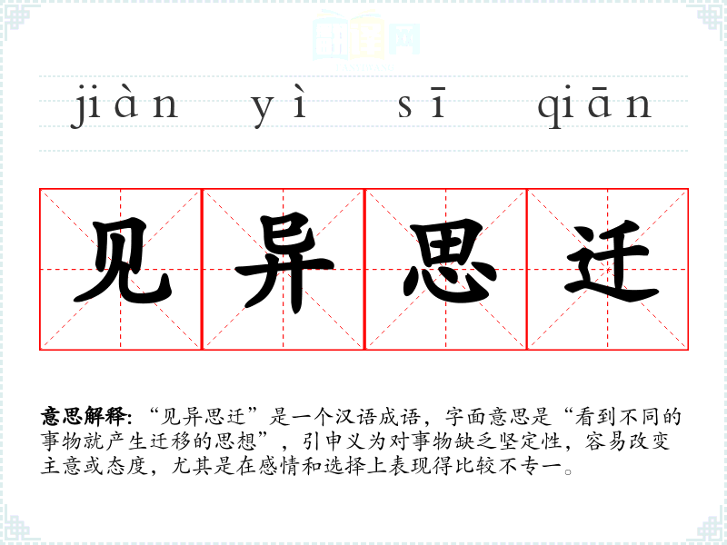 “见异思迁”是一个汉语成语,字面意思是“看到不同的事物就产生迁移的思想”,引申义为对事物缺乏坚定性,容易改变主意或态度,尤其是在感情和选择上表现得比较不专一。
