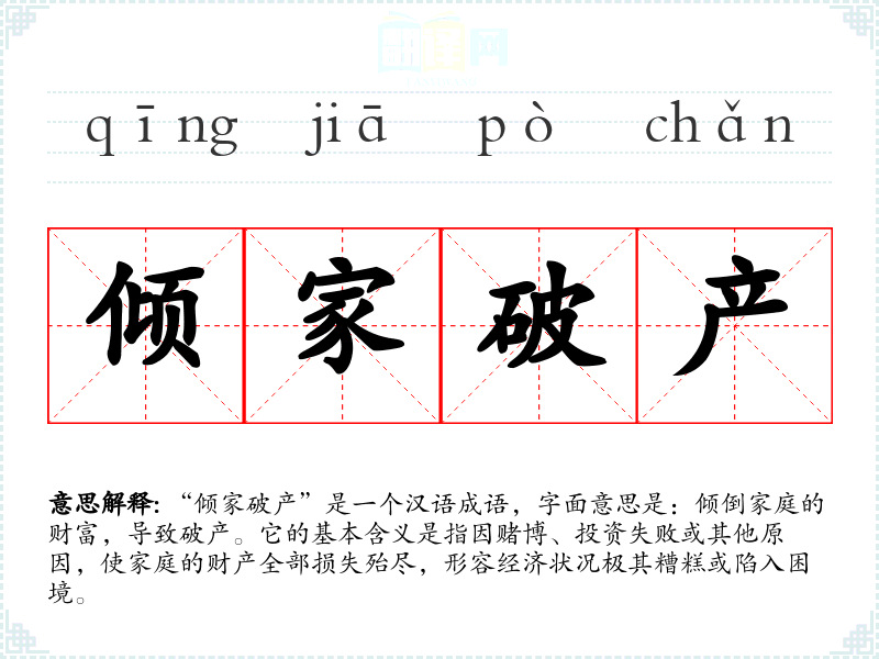 “倾家破产”是一个汉语成语,字面意思是:倾倒家庭的财富,导致破产。它的基本含义是指因赌博、投资失败或其他原因,使家庭的财产全部损失殆尽,形容经济状况极其糟糕或陷入困境。