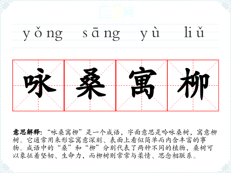 “咏桑寓柳”是一个成语,字面意思是吟咏桑树,寓意柳树。它通常用来形容寓意深刻、表面上看似简单而内含丰富的事物。成语中的“桑”和“柳”分别代表了两种不同的植物,桑树可以象征着坚韧、生命力,而柳树则常常与柔情、思念相联系。