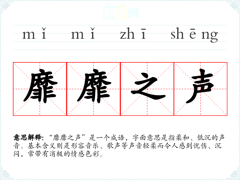 “靡靡之声”是一个成语,字面意思是指柔和、低沉的声音。基本含义则是形容音乐、歌声等声音轻柔而令人感到忧伤、沉闷,常带有消极的情感色彩。