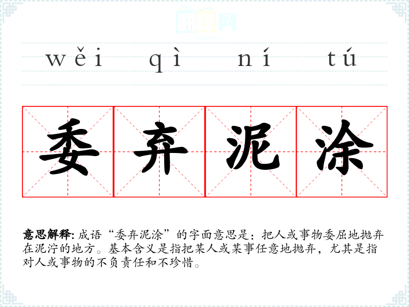 成语“委弃泥涂”的字面意思是:把人或事物委屈地抛弃在泥泞的地方。基本含义是指把某人或某事任意地抛弃,尤其是指对人或事物的不负责任和不珍惜。