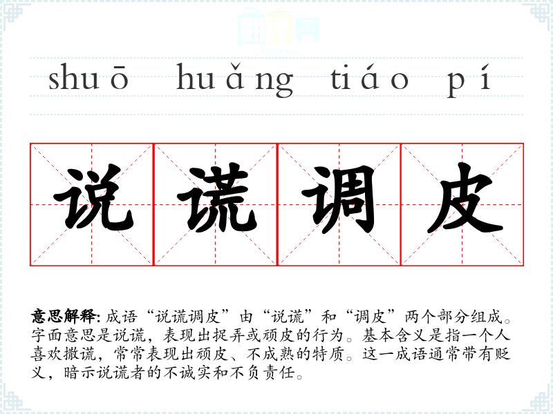 成语“说谎调皮”由“说谎”和“调皮”两个部分组成。字面意思是说谎,表现出捉弄或顽皮的行为。基本含义是指一个人喜欢撒谎,常常表现出顽皮、不成熟的特质。这一成语通常带有贬义,暗示说谎者的不诚实和不负责任。