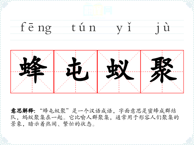 “蜂屯蚁聚”是一个汉语成语,字面意思是蜜蜂成群结队,蚂蚁聚集在一起。它比喻人群聚集,通常用于形容人们聚集的景象,暗示着热闹、繁忙的状态。