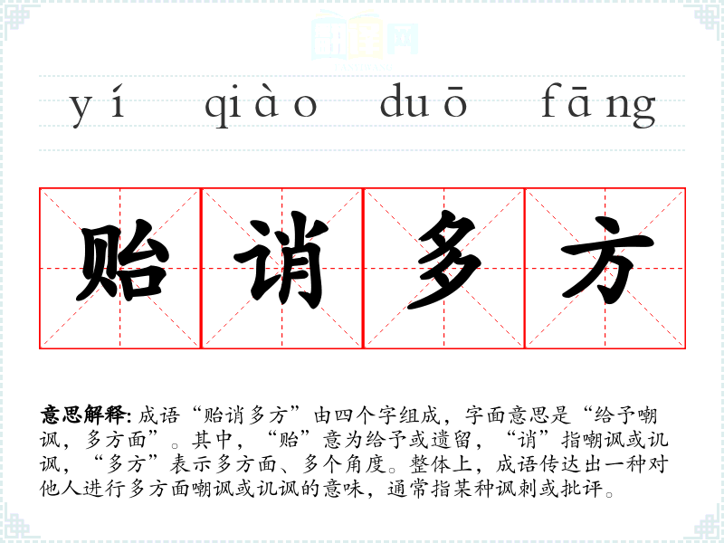 成语“贻诮多方”由四个字组成,字面意思是“给予嘲讽,多方面”。其中,“贻”意为给予或遗留,“诮”指嘲讽或讥讽,“多方”表示多方面、多个角度。整体上,成语传达出一种对他人进行多方面嘲讽或讥讽的意味,通常指某种讽刺或批评。