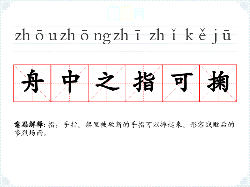 | 舟中之指可掬 | 指:手指。船里被砍断的手指可以捧起来。形容战败后的惨烈场面。 |