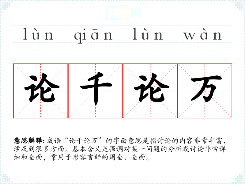 成语“论千论万”的字面意思是指讨论的内容非常丰富,涉及到很多方面。基本含义是强调对某一问题的分析或讨论非常详细和全面,常用于形容言辞的周全、全面。