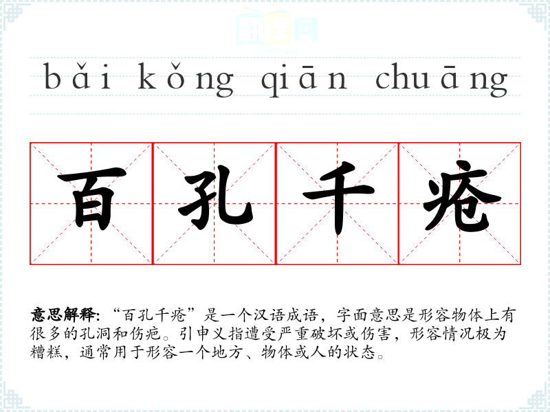“百孔千疮”是一个汉语成语,字面意思是形容物体上有很多的孔洞和伤疤。引申义指遭受严重破坏或伤害,形容情况极为糟糕,通常用于形容一个地方、物体或人的状态。