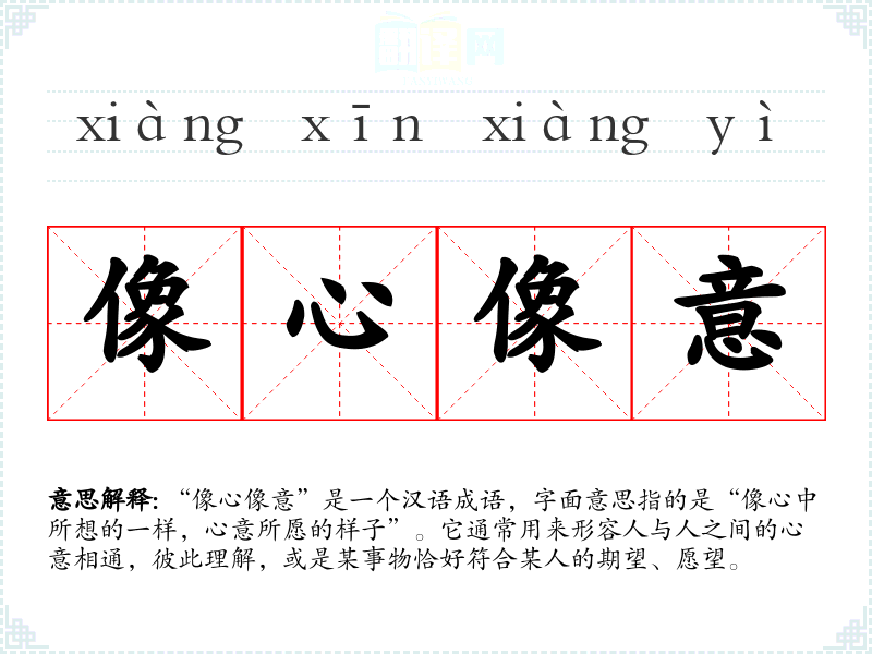 “像心像意”是一个汉语成语,字面意思指的是“像心中所想的一样,心意所愿的样子”。它通常用来形容人与人之间的心意相通,彼此理解,或是某事物恰好符合某人的期望、愿望。