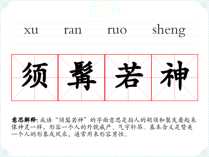 成语“须髯若神”的字面意思是指人的胡须和鬓发看起来像神灵一样,形容一个人的外貌威严、气宇轩昂。基本含义是赞美一个人的形象或风采,通常用来形容男性。