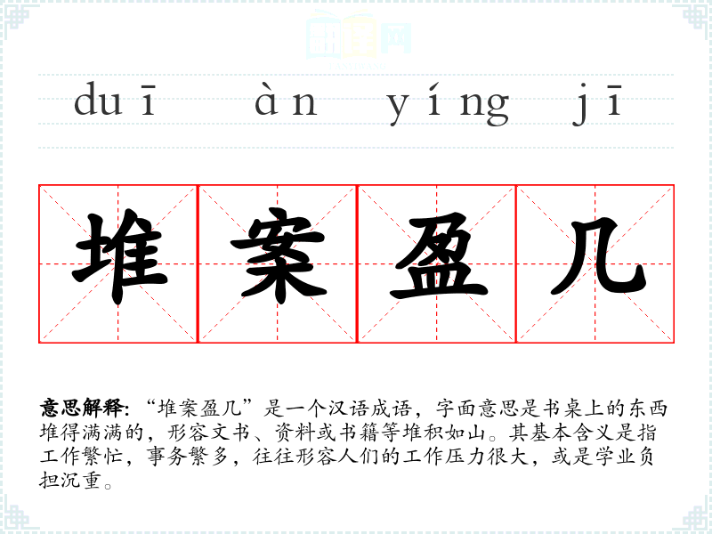 “堆案盈几”是一个汉语成语,字面意思是书桌上的东西堆得满满的,形容文书、资料或书籍等堆积如山。其基本含义是指工作繁忙,事务繁多,往往形容人们的工作压力很大,或是学业负担沉重。