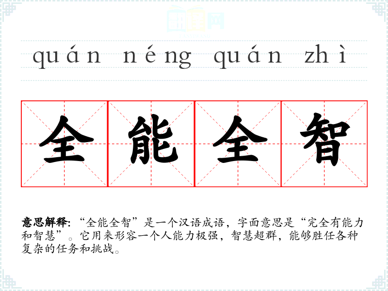 “全能全智”是一个汉语成语,字面意思是“完全有能力和智慧”。它用来形容一个人能力极强,智慧超群,能够胜任各种复杂的任务和挑战。