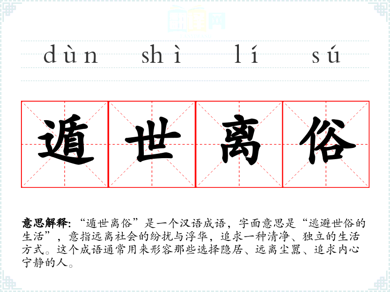 “遁世离俗”是一个汉语成语,字面意思是“逃避世俗的生活”,意指远离社会的纷扰与浮华,追求一种清净、独立的生活方式。这个成语通常用来形容那些选择隐居、远离尘嚣、追求内心宁静的人。