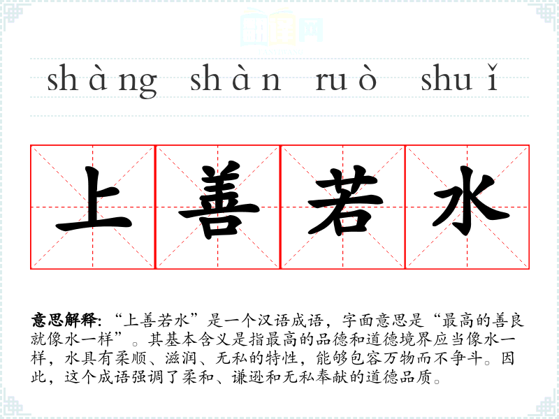 “上善若水”是一个汉语成语,字面意思是“最高的善良就像水一样”。其基本含义是指最高的品德和道德境界应当像水一样,水具有柔顺、滋润、无私的特性,能够包容万物而不争斗。因此,这个成语强调了柔和、谦逊和无私奉献的道德品质。