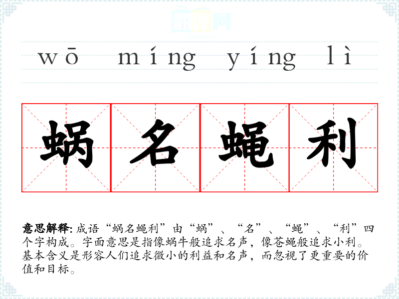 成语“蜗名蝇利”由“蜗”、“名”、“蝇”、“利”四个字构成。字面意思是指像蜗牛般追求名声,像苍蝇般追求小利。基本含义是形容人们追求微小的利益和名声,而忽视了更重要的价值和目标。