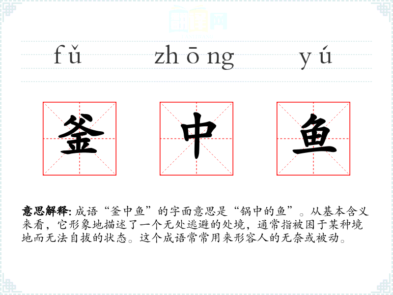 成语“釜中鱼”的字面意思是“锅中的鱼”。从基本含义来看,它形象地描述了一个无处逃避的处境,通常指被困于某种境地而无法自拔的状态。这个成语常常用来形容人的无奈或被动。