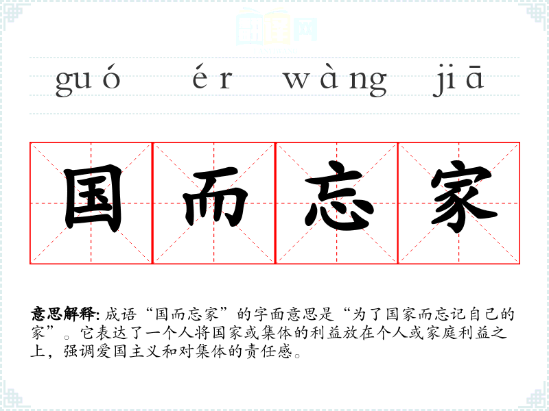 成语“国而忘家”的字面意思是“为了国家而忘记自己的家”。它表达了一个人将国家或集体的利益放在个人或家庭利益之上,强调爱国主义和对集体的责任感。