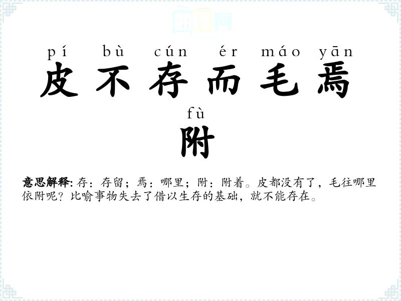 | 皮不存而毛焉附 | 存:存留;焉:哪里;附:附着。皮都没有了,毛往哪里依附呢?比喻事物失去了借以生存的基础,就不能存在。 |