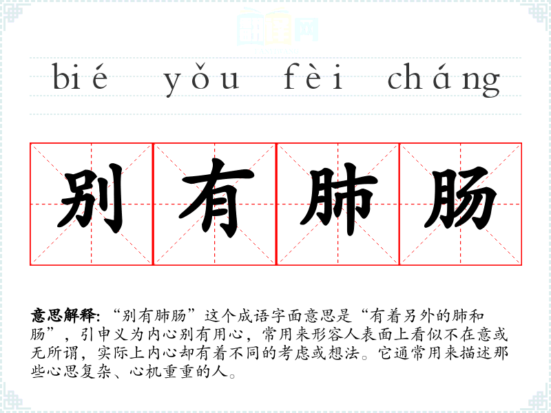 在英文中,类似的表达可以是“hidden agenda”,意思是某人内心潜藏的目的或意图。这两者都强调了表面与内心的不一致,但“别有肺肠”更富有文化色彩,展现了**人对人性复杂性的深刻理解。
