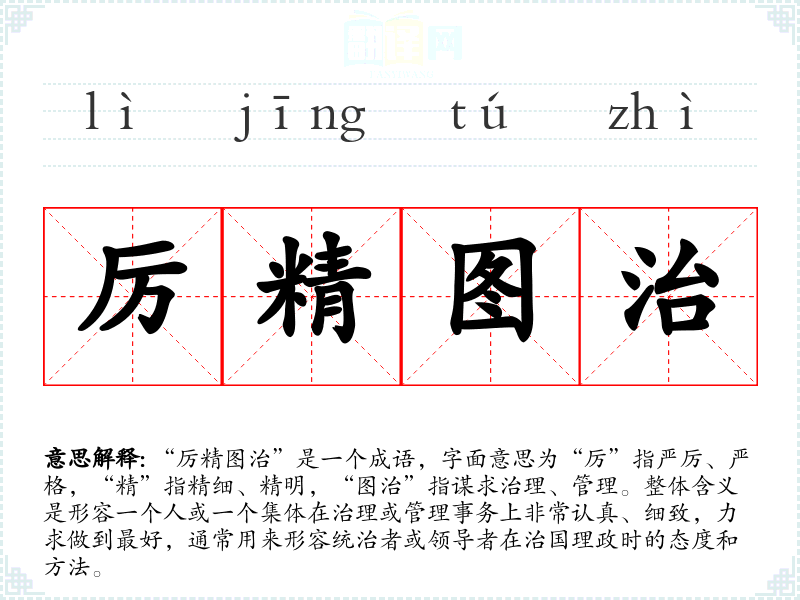 “厉精图治”是一个成语,字面意思为“厉”指严厉、严格,“精”指精细、精明,“图治”指谋求治理、管理。整体含义是形容一个人或一个集体在治理或管理事务上非常认真、细致,力求做到最好,通常用来形容统治者或领导者在治国理政时的态度和方法。
