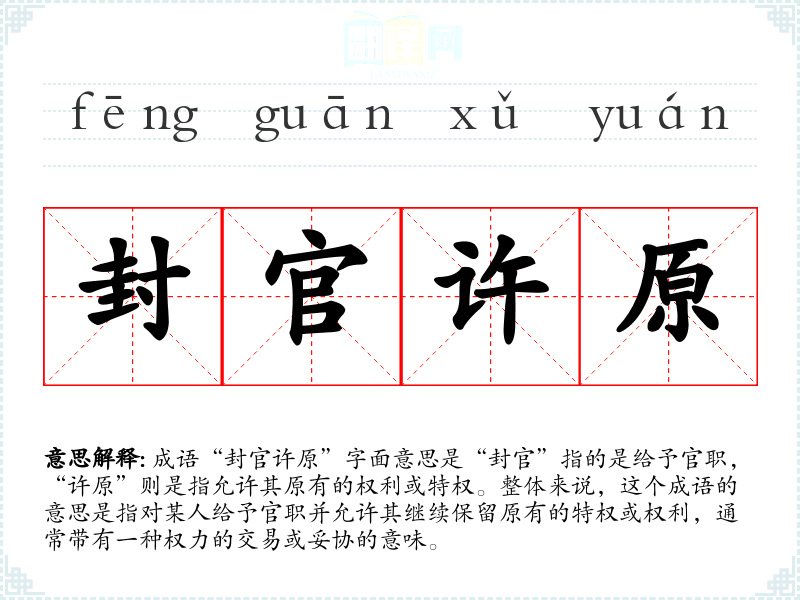 成语“封官许原”字面意思是“封官”指的是给予官职,“许原”则是指允许其原有的权利或特权。整体来说,这个成语的意思是指对某人给予官职并允许其继续保留原有的特权或权利,通常带有一种权力的交易或妥协的意味。