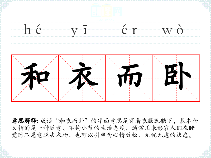 成语“和衣而卧”的字面意思是穿着衣服就躺下,基本含义指的是一种随意、不拘小节的生活态度,通常用来形容人们在睡觉时不愿意脱去衣物,也可以引申为心情放松、无忧无虑的状态。