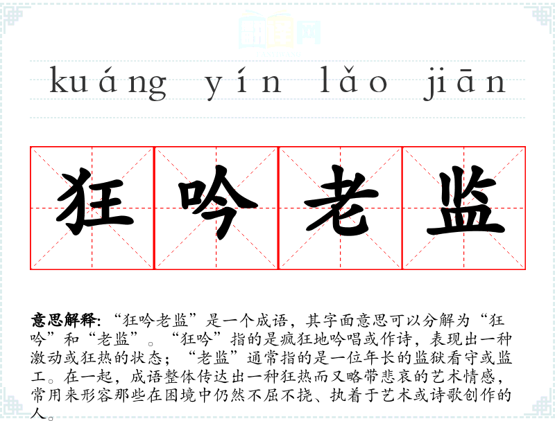“狂吟老监”是一个成语,其字面意思可以分解为“狂吟”和“老监”。“狂吟”指的是疯狂地吟唱或作诗,表现出一种激动或狂热的状态;“老监”通常指的是一位年长的监狱看守或监工。在一起,成语整体传达出一种狂热而又略带悲哀的艺术情感,常用来形容那些在困境中仍然不屈不挠、执着于艺术或诗歌创作的人。