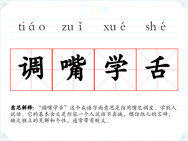 “调嘴学舌”这个成语字面意思是指用嘴巴调皮、学别人说话。它的基本含义是形容一个人说话不真诚,模仿他人的言辞,缺乏独立的见解和个性,通常带有贬义。