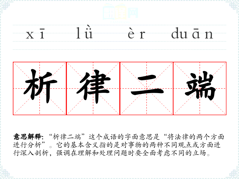 “析律二端”这个成语的字面意思是“将法律的两个方面进行分析”。它的基本含义指的是对事物的两种不同观点或方面进行深入剖析,强调在理解和处理问题时要全面考虑不同的立场。